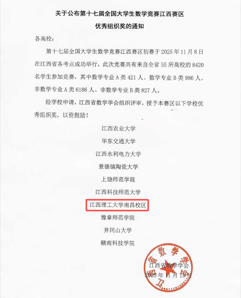 全国大学生数学竞赛是由中国数学学会主办的一项全国性高水平学科竞赛,旨在推动高校数学教学改革,激发学生学习数学的热情,培养数学创新人才。本届江西赛区初赛吸引了全省55所高校的8420名学生参与,竞争十分激烈。